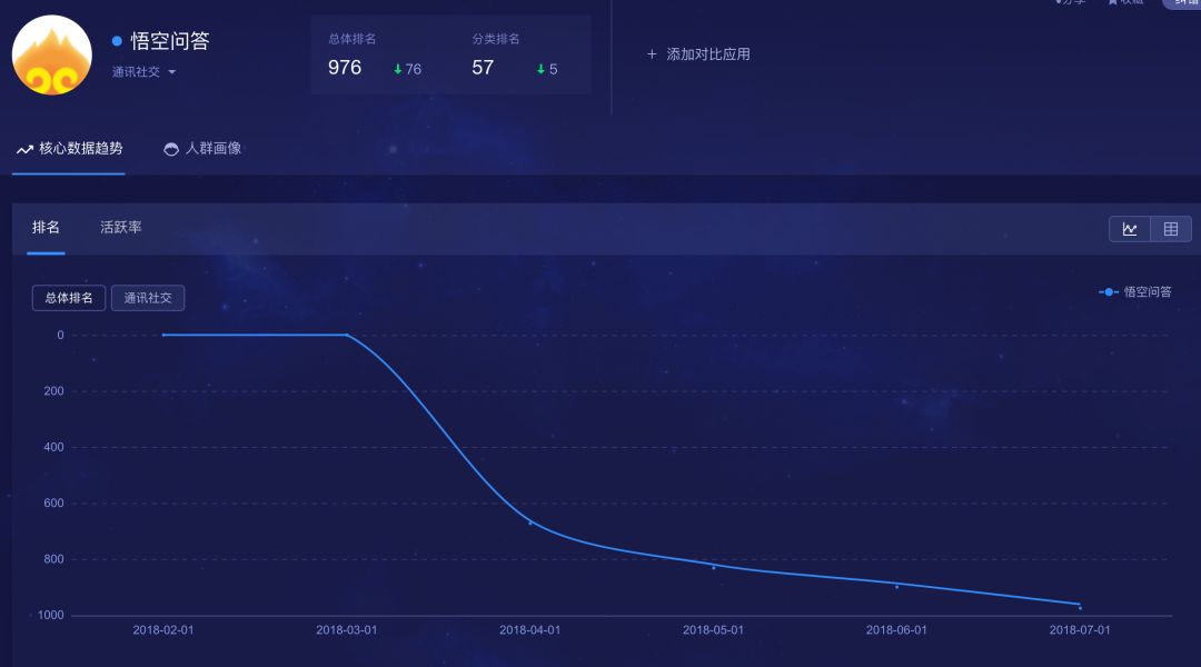 比如在极光大数据上,知乎的在全渠道的总排名是114名,而悟空问答则跌到了976名,并且从增长曲线来看,悟空问答持续下滑。