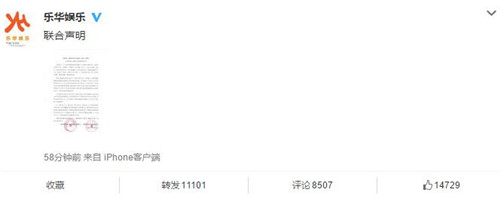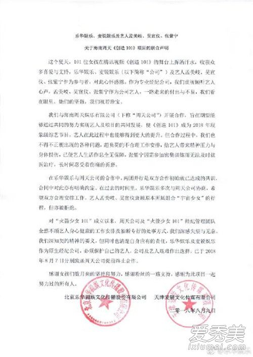 联合声明,称与《创造101》的合作中,超负荷的不合理工作安排,使艺人生活作息全无保障,为了保护艺人,已于2018年8月7日分别致函周天公司提前终止合作。