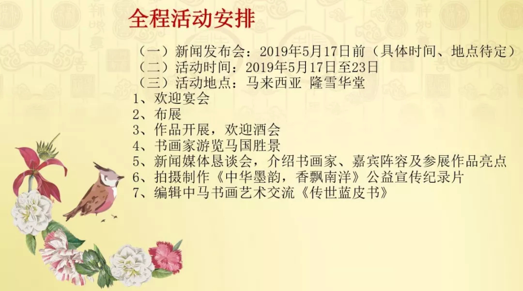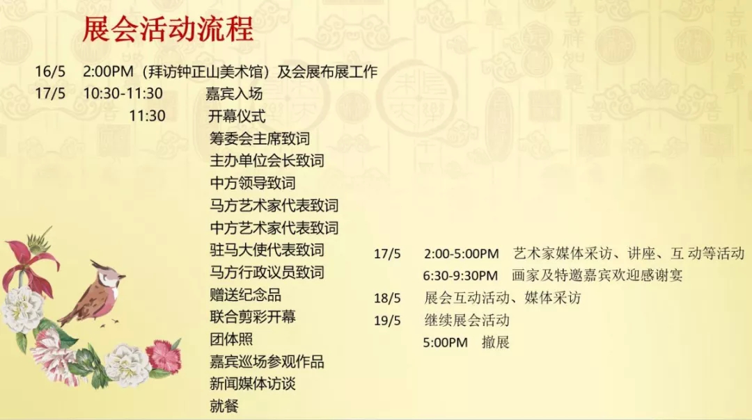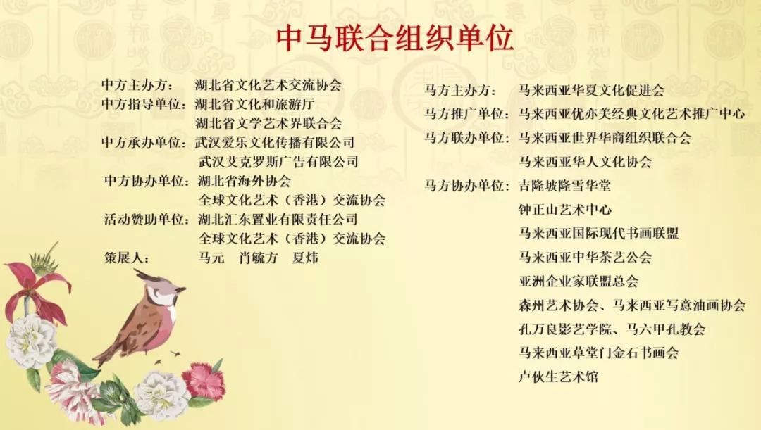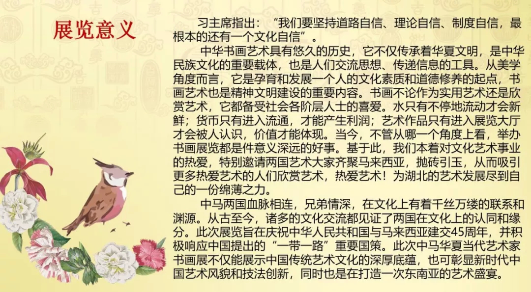 此次活动以书画艺术展览促进中马两国文化艺术交流,以文化艺术交流见证两国文脉相连,艺脉相通;见证两国人民友谊地久天长!愿以此顶级书画艺术展,开启中马艺术交流的新篇章!