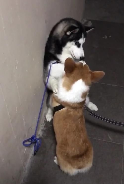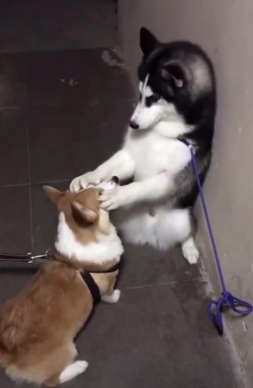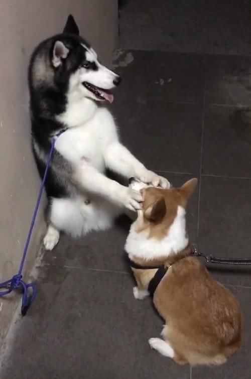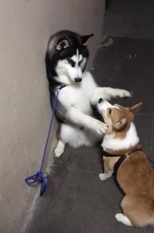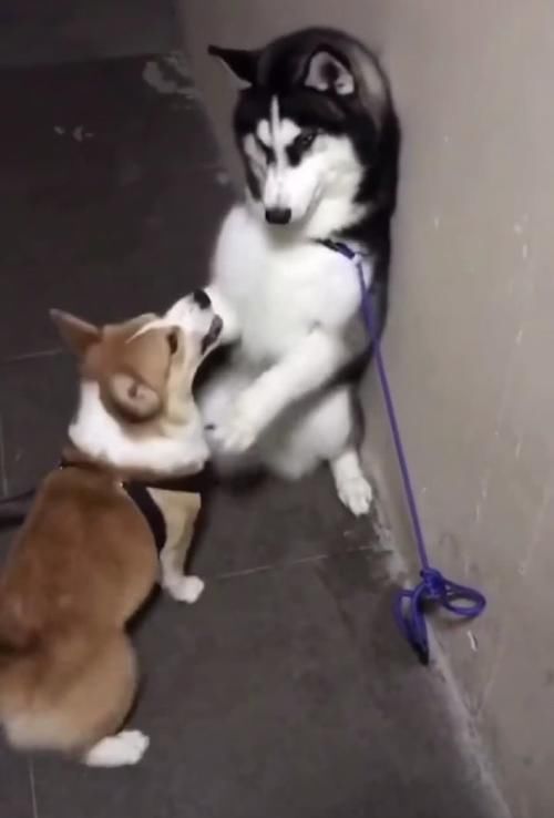 于是就发生了这样的一幕,二哈看到柯基犬的体型比自己小那么多,便开始叫唤、挑衅。