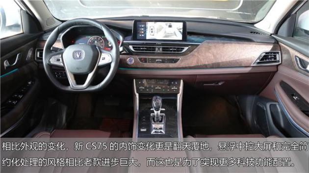 老款CS75的内饰造型可能没有外观那么好看,但是新款CS75的内饰恐怕要比它的外观更加好看。首先是设计风格上完全革新为简约时尚设计。在做工和用料上,新CS75大面积采用了皮质包裹和软质的材料,门板上大量的柔软皮革触感优良,中控上方则是软质搪塑材质。除此之外,新CS75还大量采用了钢琴烤漆面板,中控T字区域下方和四门关窗按键周围都采用了烤漆面板,其镜面显档次感,但也容易留下指纹。