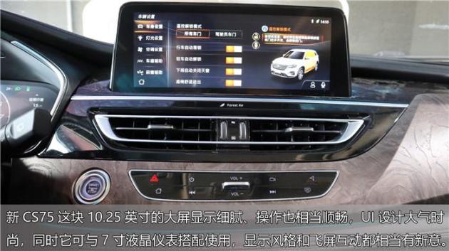 在内饰的配置上,新CS75全系标配了这块10.25英寸的中控大屏,其支持触控和三指飞屏,意思是当你需要在液晶仪表盘上显示导航信息时,只需用三根指头把中控大屏的导航信息向仪表划过去,液晶仪表将自动调整显示导航信息。