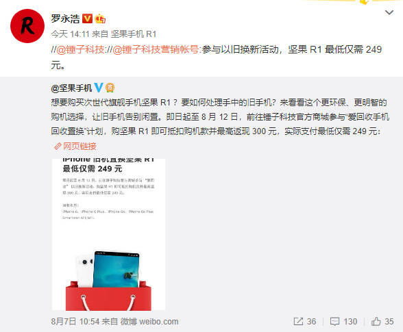 锤科宣布的这次iPhone旧机换坚果R1活动,自8月7日日起至8月12日结束,在锤子科技官方商城就能参与“爱回收手机回收置换”计划,购坚果R1即可抵扣购机款并最高返现300元,实际支付最低仅需249元。回收机型仅仅接受苹果旧手机和锤子自家的旧手机:iPhone 6、iPhone 6 Plus、iPhone 6s、iPhone 6s Plus、Smartisan M1/M1L。