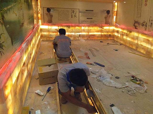 邯郸托玛琳汗蒸房装修功能地板一般为电气石原矿地板砖、赭石地板砖、盐晶石地板砖、砭石地板砖等。并根据客户要求的功能以及用途加入了能够##的#物元素