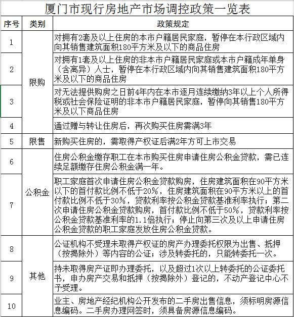 厦门现行的针对购房者的房地产楼市调控政策包括限购、限售、差别化信贷等。此前,厦门对非户籍人士限购1套180平方米及以下的商品住房,但需在购房之日前4年内逐月连续缴纳3年以上个人所得税或社会保险证明。