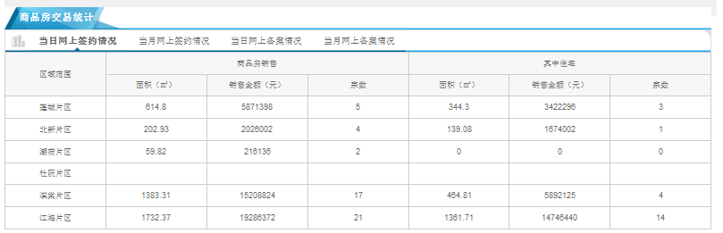 江海片区商品房成交21套,合计面积为1732.37方米,金额54762855元,平均价格为31612元/平方米。其中,住宅14套,合计面积为1361.71平方米,金额14746440元,平均价格为10829元/平方米。