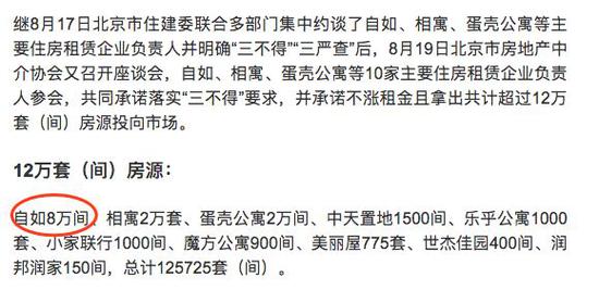 也就是说,2018年8月23日,链家网放出来的、普通消费者可以租到的北京的房子是12393间,其中包含了链家网以及旗下的,自如整租、自如合租的房子,从这个数据里,我们发现了一个大问题。那就是大概一周前,8月17日北京住建委约谈了几家中介公司,最终的结果是自如、相寓和蛋壳承诺将拿出12万间房子投入市场,其中,自如将拿出8万间