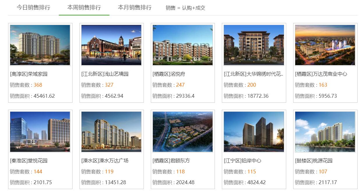 在单个楼盘销售排行榜上,都市圈的中交荣域以368套的销售数据排名第一,其次是江北的金地浅山艺境上传了327套数据,第三是栖霞区的电建洺悦府,上传了247套数据。