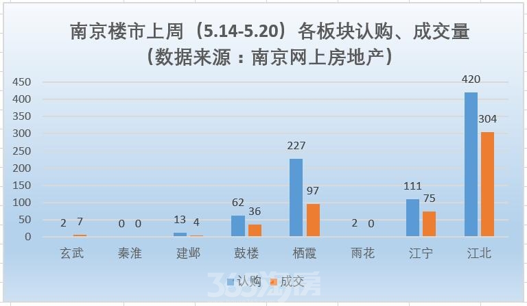 从上周南京楼市的新房认购情况来看,江北以420套的数据排名第一,其次是栖霞的227套,江宁则以111套排名第三。成交数据上,江北以304套数据的优势占据第一位置,其次为栖霞97套数据,江宁以75套的数据排名第三。