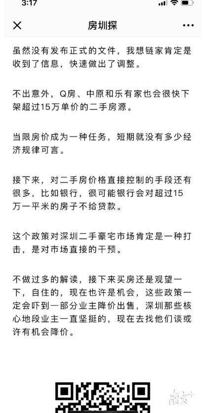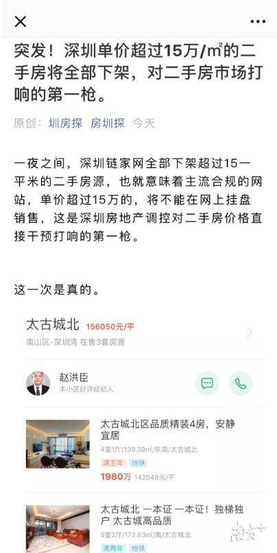 名为“房圳探”的微信公众号发布名为《突发!深圳单价超过15万/平方米的二手房将全部下架,对二手房市场打响的第一枪》文章称,“一夜之间,深圳链家网全部下架超过15万一平米的二手房源,也就意味着主流合规的网站,单价超过15万的,将不能在网上挂盘销售,这是深圳房地产调控对二手房价格直接干预打响的第一枪。”
