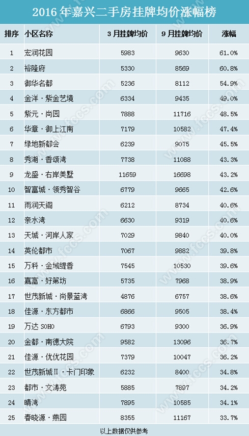 比如位于科技城板块的宏润花园,3月出售的挂牌均价才5983元/㎡,到了9月以涨至9600多,涨幅61.0%;同在该板块内的华章·御上江南()、绿地新都会、英伦都市、佳源·东方都市()、嘉富·好第坊也都榜上有名,涨幅较大。