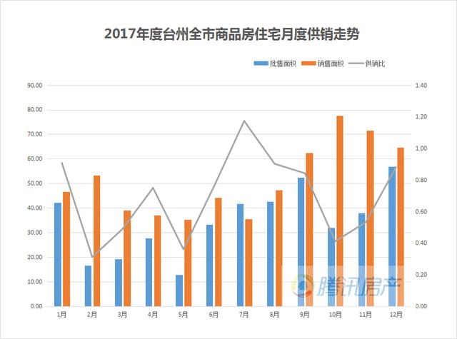 据腾讯房产台州不完全统计,全市供应量415.46万方,成交量614.47万方,有新房源入市的项目合计111个,占2017年在售总项目数的36.51%;2017年共有304个商品房项目有成交动态,月均销售3000以上的热销项目共48个;