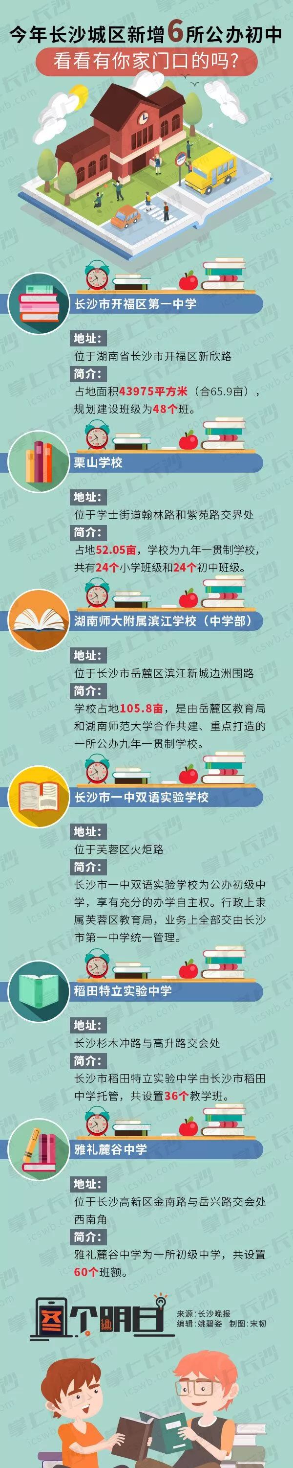 今年9月,全市将有6所新建中学投入使用。这6所中学分别为开福区第一中学、栗山中学、湖南师大附属滨江学校(中学部)、长沙市一中双语实验中学、稻田特立实验中学、雅礼麓谷中学。“6所学校预计提供3000多个学位。”
