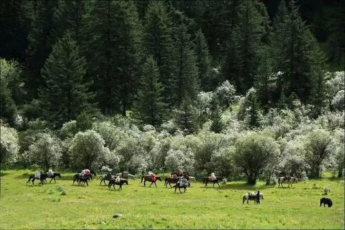 横穿这片草原,就可看见措普湖了。越过一个小山包,措普湖犹如一面蓝色宝镜展现在我们眼前。雪山、森林、草地加上这晶莹剔透犹如水晶般的湖,瞬间让人感觉到尘世间所有的繁杂琐事都被涤荡得一干二净。