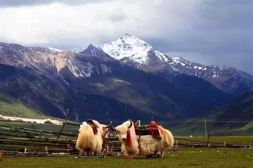 再往上行,就是七彩草原——章德草坝。在雪山的环拥下,初夏的章德大草原还未全然泛绿,不过依然可以看见成群的牛羊、顶顶帐篷、袅袅炊烟。