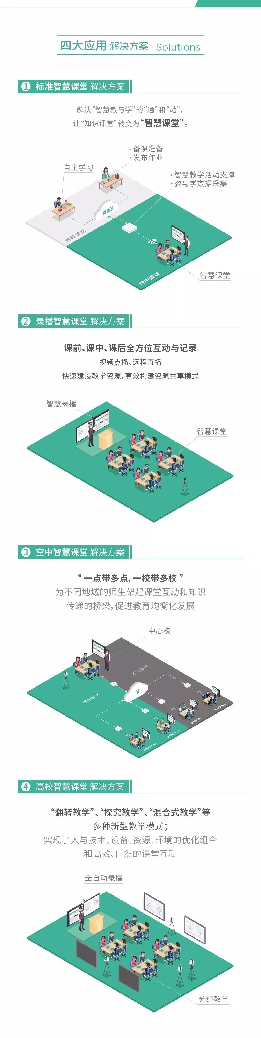 青鹿教育精心设计了四大应用解决方案:标准智慧课堂解决方案、录播智慧课堂解决方案、空中智慧课堂解决方案、多屏协作解决方案,完美适配实际教学场景,实现了多屏互动、及时反馈、微课录制、远程直播、专递课堂、双师课堂、分组探究等核心应用。