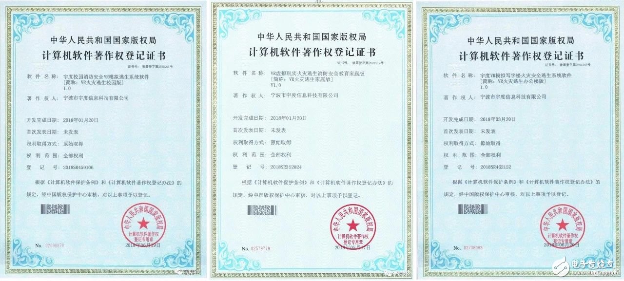 黎少华:公司已经研发出了五款安全教育的产品(VR火灾逃生家庭版,VR火灾逃生企业版,VR火灾逃生校园版,VR火灾逃生地铁版,VR安全隐患排查家庭版),目前已经获得了由中华人民共和国国家版权局审核并颁发的三项《计算机软件著作权登记证书》。