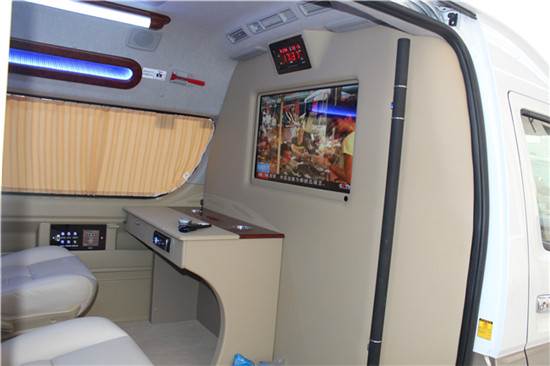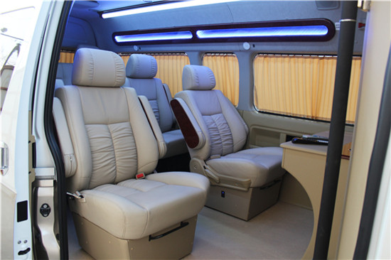 丰田海狮改装面包车虽然外观的设计上其貌不扬,但是在内饰的改装上却有着自己的特色和独特。丰田海狮改装面包车在内饰的设计上注重舒适感和实用性的完美融合。所以丰田海狮改装面包车配备了舒适的座椅和高档的办公桌,办公追哦上增加桃木和真皮的装饰,凸显出丰田海狮改装面包车的尊贵之感。而丰田海狮的办公桌设计同样还带有抽屉的设计,可以存放我们在旅行中的重要文件。