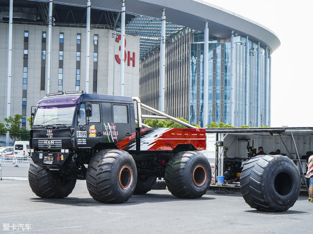 超大个头的改装大轮车在开展前一天已经抵达现场,MONSTER大轮车展示秀将在活动当天的10:40-11:10和15:10-15:40进行两场表演。