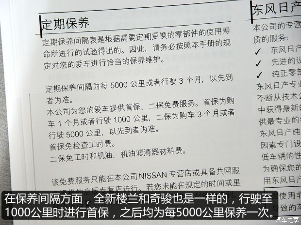在保养间隔方面,全新楼兰和奇骏也是一样的,行驶至1000公里时进行免费检查,5000公里时进行免费的首次保养,之后则为每5000公里保养一次。