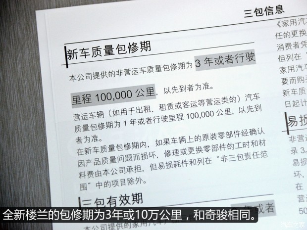 我们在经销商处了解到,全新楼兰在质保政策方面和奇骏车型是相同的,两者均为3年或10万公里的包修服务,而三包有效期则依旧是2年或5万公里,消费者在行使权益时以前者为准即可。