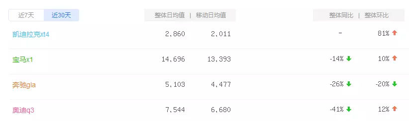 凯迪拉克XT4自从诞生之日起就被称为踢馆BBA的重量级产品,亦是冲击二线豪华品牌的种子选手。从百度指数也可以看出,作为一款新车凯迪拉克XT4虽然在数据总量上尚不及同级竞品宝马X1奔驰GLA奥迪Q3,但近30天来的增长百分比仍然不容小觑。