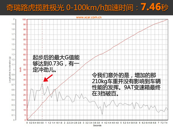 最终的结果比较出乎我们的意料。虽然体重增加了210kg,但最终测得的百公里加速时间为7.46秒,反而比原进口版车型官方标定的时间(7.6秒)还快了一些。发动机在加速过程中的表现很线性,四驱系统则在起步时帮了不少的忙。