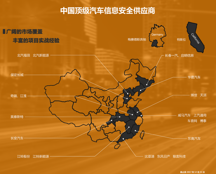截止12月31日,360智能网联汽车安全实验室已经成为梅赛德斯奔驰、特斯拉、北汽福田、北汽新能源、保定长城、奇瑞、江淮、英泰斯特、长安汽车、江铃新能源、长春一汽、启明信息、华晨汽车、博世、天派、威马汽车、上汽通用、车音网、博泰、东南汽车、比亚迪、东风日产、联友科技等诸多汽车厂商的信息安全供应商,拥有丰富的项目实战经验。