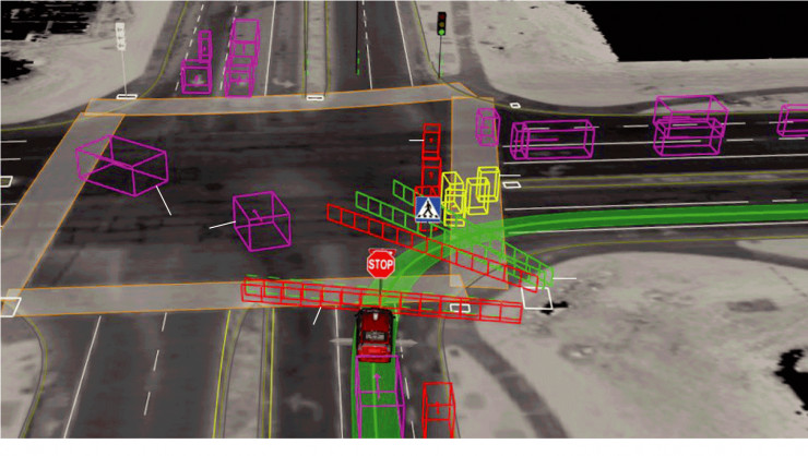 通过各种传感器的协同作用,自动驾驶汽车将收集到周围物体的一系列相关信息——例如体积大小、运行速度等。之后,主控系统会根据这些物体的运动特征将其分类并显示出来。例如用红色的方块代表自行车,用黄色的方块代表行人,紫色的方块代表机动车等(如上图所示)。
