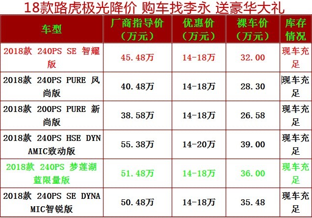 【凤凰网汽车行情原创】近日,4S旗舰店在举办2018款路虎极光团购会活动,现场购车可享多重优惠!全系车型享受18.88万元销售全国手续齐全(发票,合格证,车辆一致性证书,PDI检测证书,保养手册,三包凭证)全国各地均可落户上牌,全国联保,所有手续随车走,本次优惠由厂家返点直接让利,本公司承诺无任何捆绑销售,活动包含:现金降价,豪华精品礼包赠送,活动车辆支持按揭贷款,手续便捷,2小时下款(不收取任何费用,免息,全国可分期),外地客户购车成功可报销三个人路费(动车,高铁,飞机,注:飞机限制两个人二等舱,需凭票据报销)活动详情及其他优惠信息请拨打文章底部热线