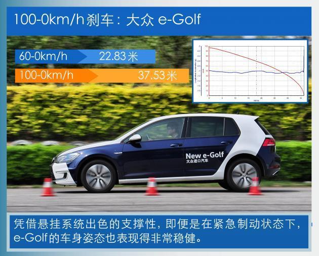 脚感扎实的刹车踏板在全力制动状态下给予了驾驶者相当充实的自信心,ABS系统的介入并不突兀,强劲且均匀线性的制动力使得e-Golf从100-0km/h刹停只用了37.53m。