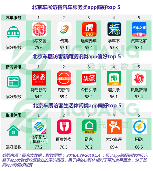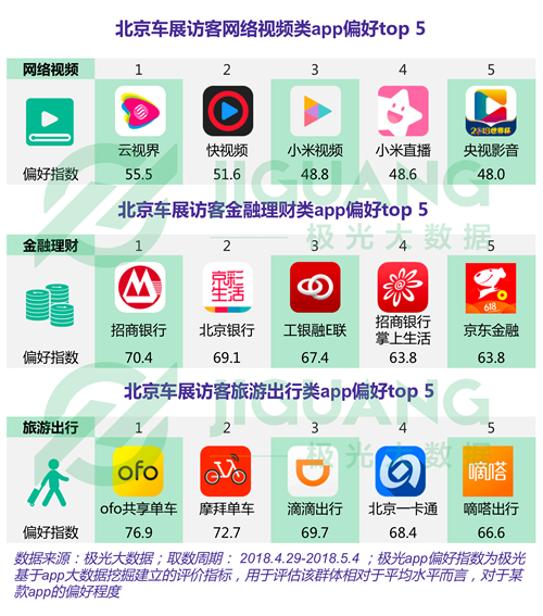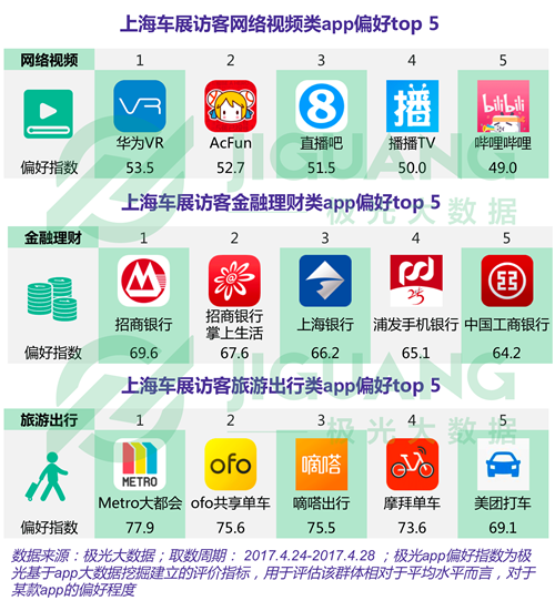 在网络视频领域,以体育赛事直播为主的直播吧最受广州车展访客偏爱,以60.1的偏好指数位列第一;在金融理财领域,招商银行掌上生活等5款银行官方服务app进入偏好前五;在旅游出行领域,摩拜单车以75.2的偏好指数位列第一。