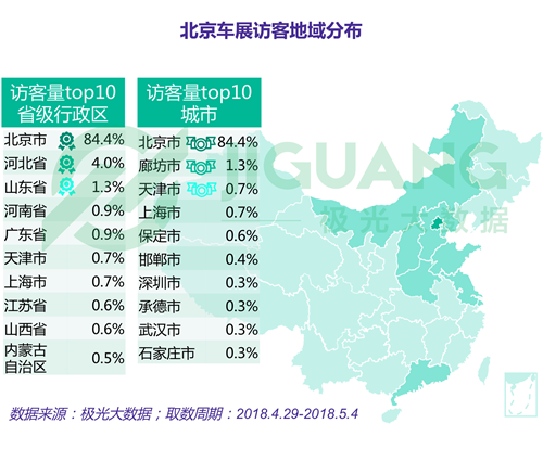 北京车展本地访客超过8成;除了北京本地访客外,河北省和山东省是两个访客主要的来源省份,占比分别是4%和1.3%;城市分布中,廊坊市访客占比达1.3%、天津市访客占比为0.7%,分列第二、第三名。
