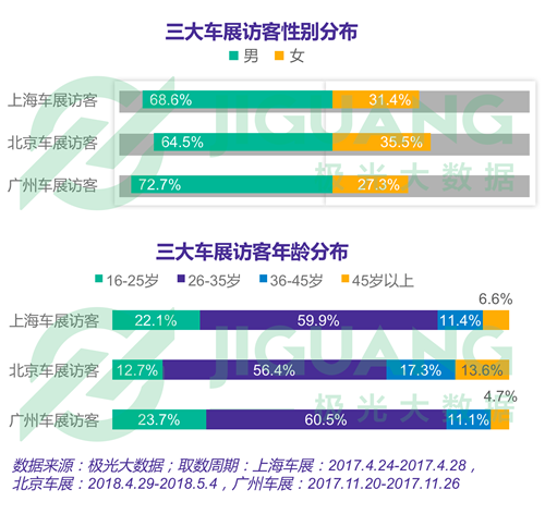 极光大数据(纳斯达克股票代码:JG)发布《中国4S店访客数据分析报告》,本报告分为汽车4S店访客画像、中国车展访客画像以及汽车服务类app人群画像三大部分。本章节将围绕中国三大车展访客的年龄性别、地域、应用偏好等维度进行分析。完整版本可登录极光官网或微信公众号lovejpush下载。