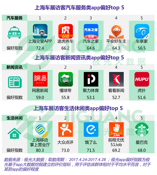在汽车服务领域,app以72.4的偏好指数位列第一,同时,途虎养车、汽车之家、平安好车主和车享家进入偏好前五;在新闻资讯领域,网易新闻以59的偏好指数位列第一;在生活休闲领域,除了上海移动掌上营业厅之外,大众点评、饿了么、前程无忧51Job和星巴克也进入了前五。