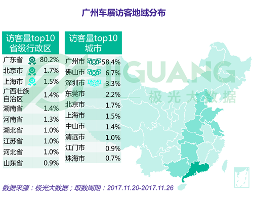 广州车展访客中,80.2%来自于广东省,其中有58.4%来自于广州本地;北京和上海是两个主要的非本省访客来源地,分别占比1.7%和1.5% 。
