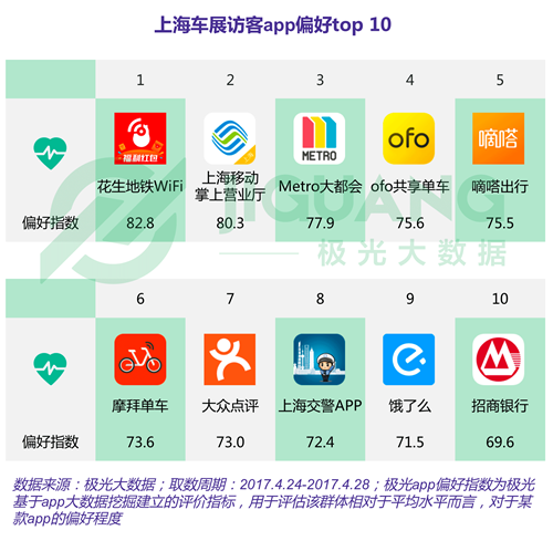 5. 上海车展访客花生地铁WiFi偏爱,北京车展访客偏爱ofo共享单车,广州车展访客偏爱汽车之家