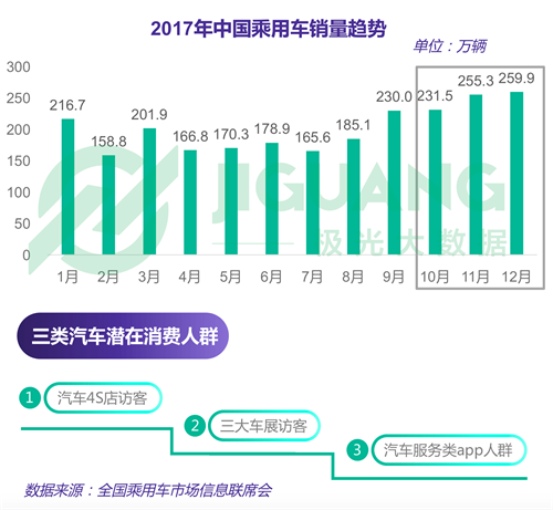 据乘联会统计,2017年全年乘用车销量达2420.8万辆,第四季度是汽车的销售旺季。在各类线上线下与汽车消费相关的场景中,有三类最主要的场景,分别是汽车4S店访客、车展访客和汽车服务类app人群;本报告重点关注的三大车展访客。