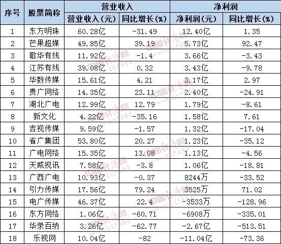 广播电视网络板块。据不完全统计,公布2018年半年度报告的广播电视网络公司有18家,仅三成净利润同比实现增长。其中,东方明珠归属于上市公司股东的净利润12.4亿元,同比增长1.35%;芒果超媒首份半年报业绩亮眼,营收49.85亿元,同比增39.19%,净利润5.73亿元,同比增92.47%。上半年亏损最严重的公司为乐视网,2018年上半年财报显示,乐视网实现营业收入98377.50万元,同比下降82.25%;实现归属上市公司股东的亏损为11.04亿元,同比下降73.36%,其上半年终端收入广告业务收入、会员及发行业务收入相较上年同期均出现大幅度的下滑。
