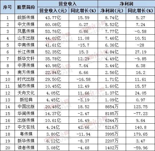 出版传媒板块。据统计,公布2018年半年度报告的出版传媒公司有20家,超七成净利润同比实现增长。其中,净利润总额排在前面的是皖新传媒,1-6月归属于上市公司股东的净利润8.74亿元,同比增长5.27%。净利润总额较低的为读者传媒,财报显示报告期内,读者传媒营业收入和净利润双双下滑,其中,营业收入为3.08亿元,同比减少4.68%,归属于上市公司股东的净利润为1401.63万元,同比减少59.96%。