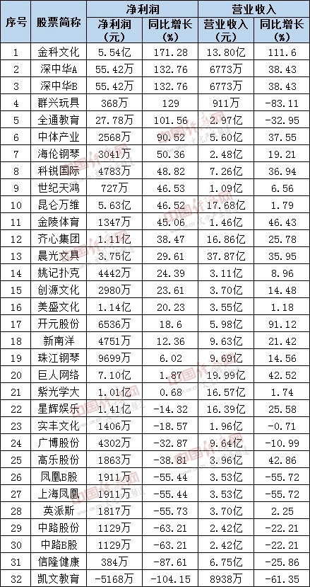 截至8月31日A股有32家文教休闲行业公司发布2018年中报业绩,净利润最高的为巨人网络,报告显示上半年其营业收入为19.99亿元,同比上年同期增长42.52%,净利润7.1亿元,同比上年同期增长1.87%。