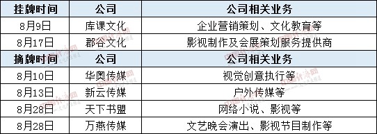 据经济日报-中国经济网记者不完全统计,8月份新三板新挂牌企业59家,与7月份持平,其中有河南库课文化科技股份有限公司、上海郡谷文化传播有限公司两家与文化产业相关的企业挂牌。8月从新三摘牌企业超过150家,比7月份减少近40家,其中,包括北京华奥视美国际文化传媒有限公司、上海新云传媒有限公司等在内的4家文化相关类企业终止挂牌。
