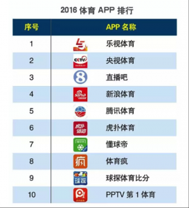 排行的榜首,央视体育、直播吧、新浪体育、腾讯体育分列二至五位。同一时间,乐视体育创始人兼