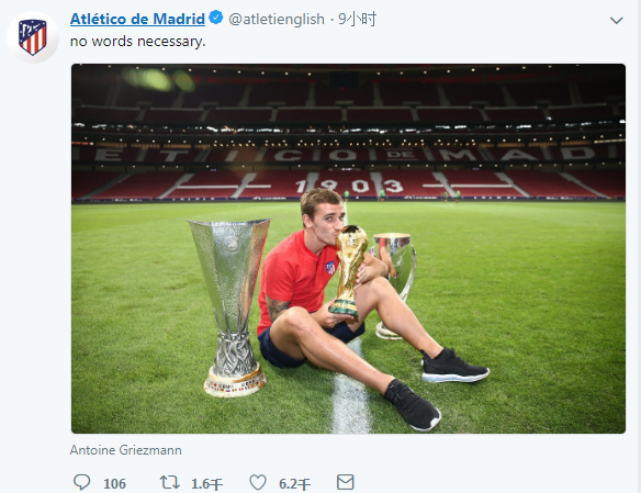 马竞官方也为格里兹曼喊冤,官推上贴出了格里兹曼与世界杯、欧联杯和欧超杯的合影图。马竞官推只说了一句话——无语。格里兹曼连续无缘欧足联和FIFA先生三甲,马竞认为“此处无声胜有声”。