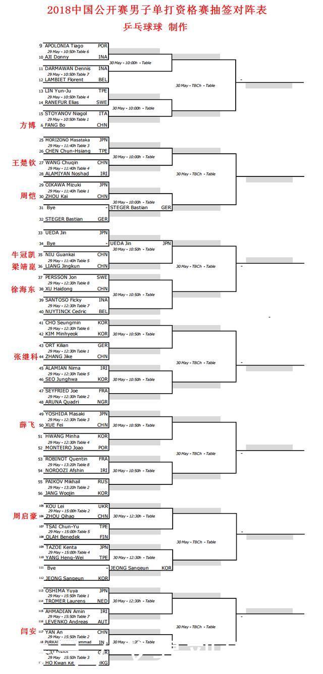 2018年5月27日中国公开赛男子单打资格赛抽签对阵表出炉,张继科等7名中国选手需要从资格赛打起。由于参赛人数较多,资格赛采取淘汰赛制,需要打三轮基本上是八个人争夺一个进入正赛名额。