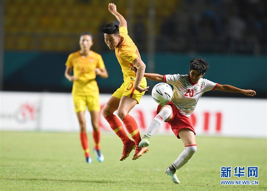 ↑8月20日,中国队球员任桂辛(上)在比赛中争顶。 当日,在第18届亚运会女足小组赛中,中国队以16比0战胜塔吉克斯坦队。 新华社记者程敏摄