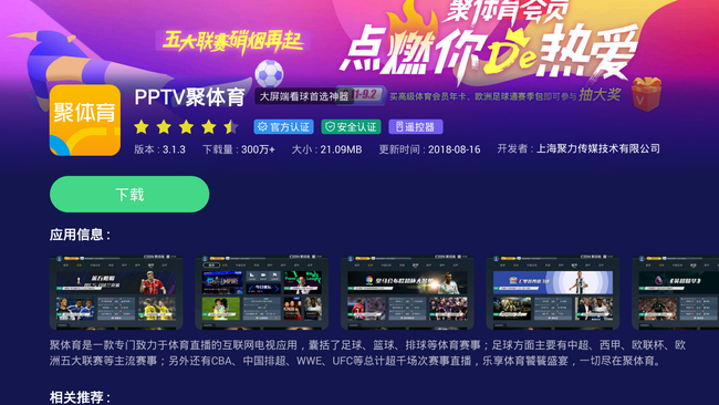 pptv聚体育是一款专门致力于体育直播的电视应用,足球,篮球,排球等赛事都能再次看到,内容丰富多彩,是很多体育爱好者必装的一款电视应用。而本次亚运会中,pptv设有专门的专题报道,用户可以收看每一日的精彩瞬间。