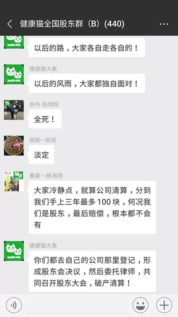 为了寻找证据,维权群里每天有大量的截图产生。8月17日晚,组织者开始到处通知私教们重新翻看完整的聊天记录,寻找任何“鼓励、支持、教我们充值课时费的语言和文字”,然后语音公放且要录频。根据组织者提供的信息,当天有一部分健康猫的股东“提供了相当有利的证据才使得案情有了新的突破”。8月15日,有消息称杨骅力在健康猫的股东微信群里表示,希望公司破产清算。