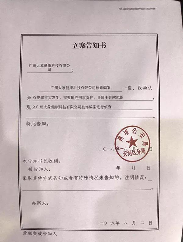 8月10日,他收到健康猫推送的一份系统公告,在公告中健康猫表示,部分私教用户“利用刷单软件、伙同他人等方式,在公司推广期间,利用公司补贴政策,恶意套现”,并附上了一份广州市天河区公安分局的立案通知书。这时距他无法提现应用中账户的资金已经过了3个月。