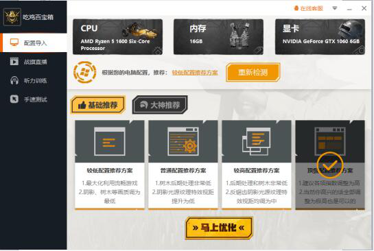 “吃鸡百宝箱”中可以自动评估玩家电脑CPU/内存/显卡等配置,自动生成一项适合本机的推荐方案。基本推荐的配置更加适合低配玩家选择适合自己的游戏设置。